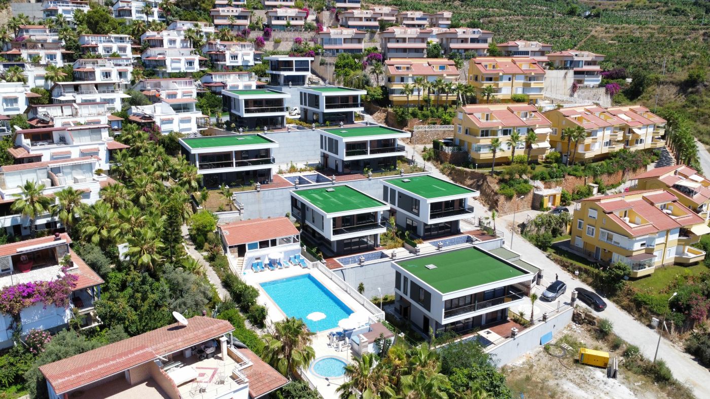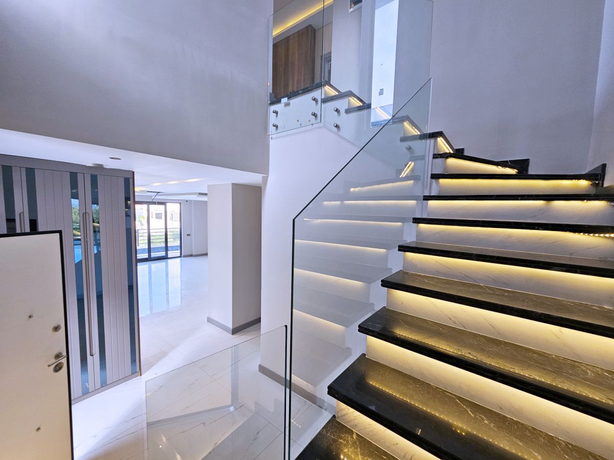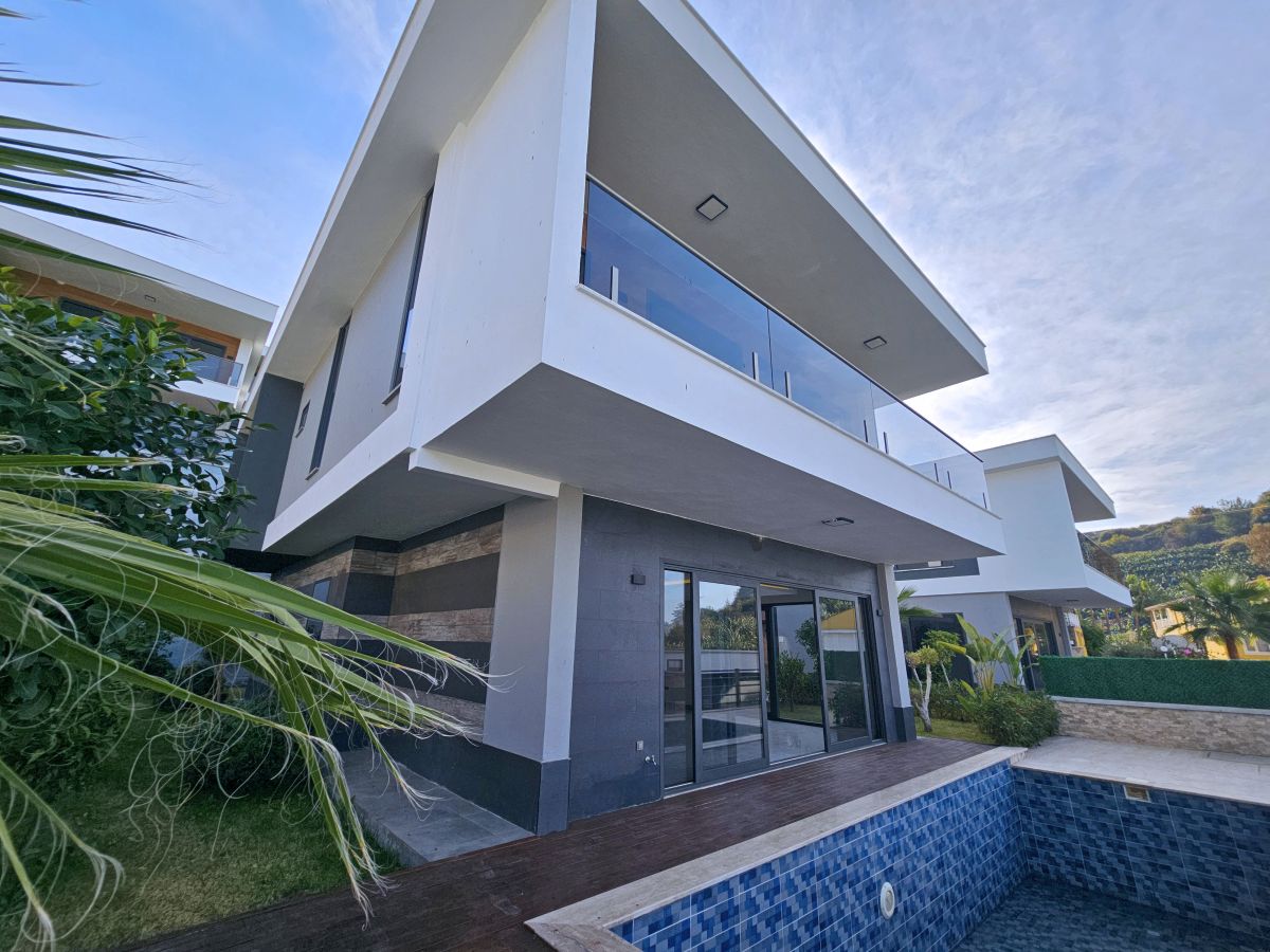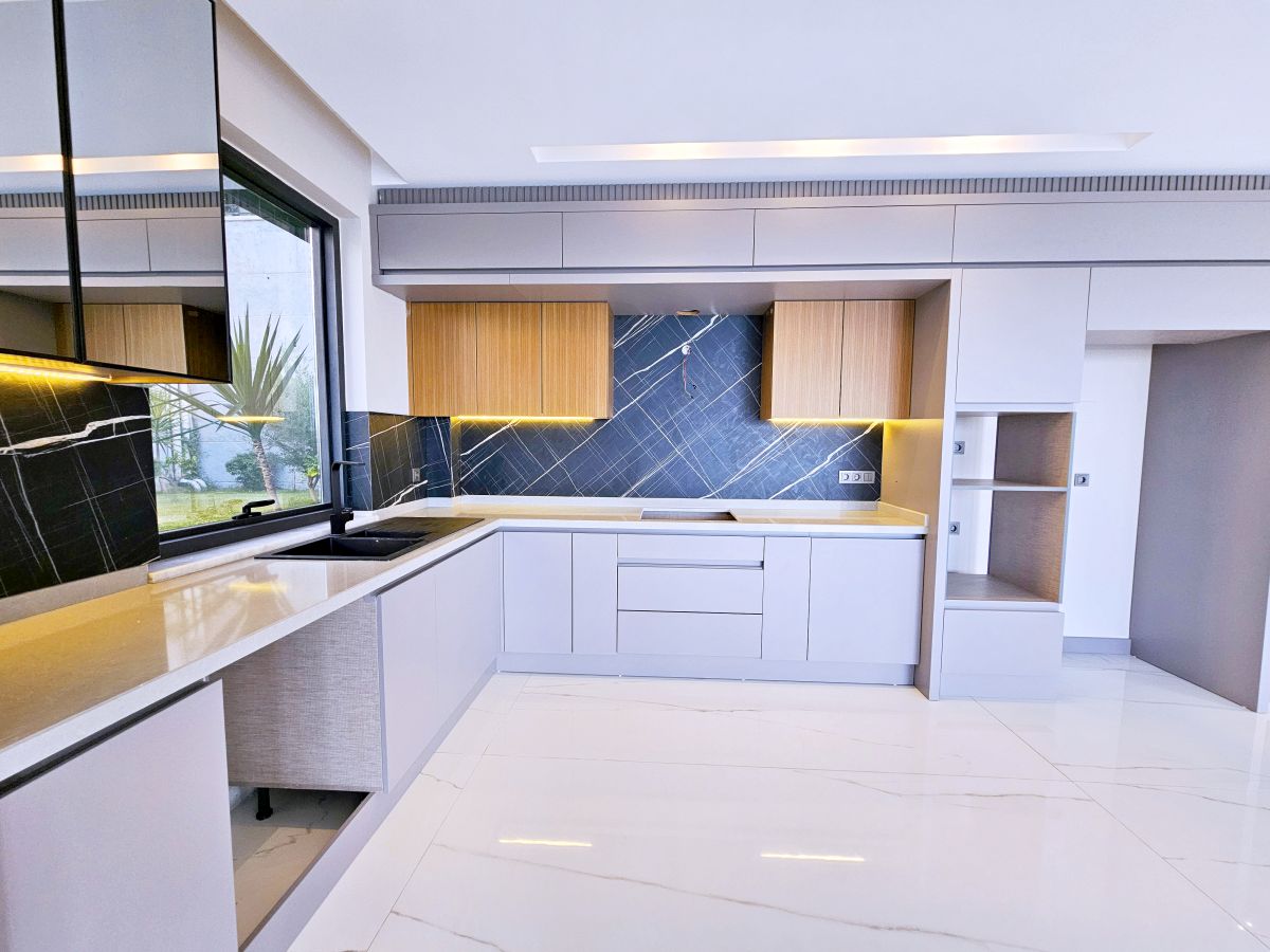 Виллы в стиле Модерн, с отделкой натуральными материалами, спот освещение, алюминиевые профильные окна и двери, подогрев пола, спутниковое ТВ и др. В стоимость входят также: кондиционер в каждой комнате и полный пакет бытовой техники. Планировка 4+1, общая площадь 230 и 250 кв.м.