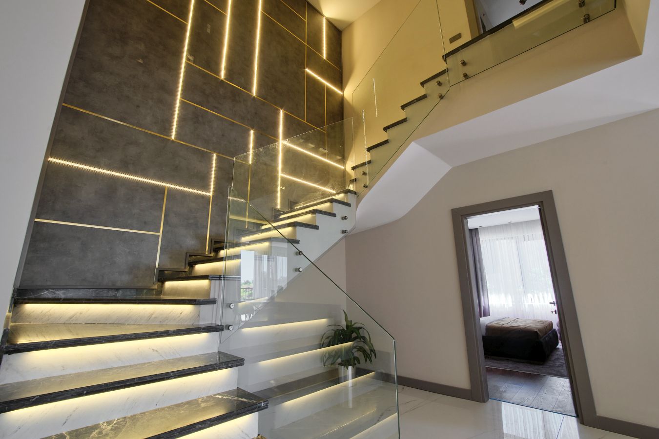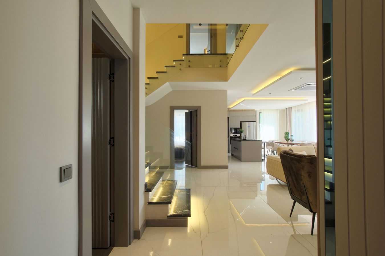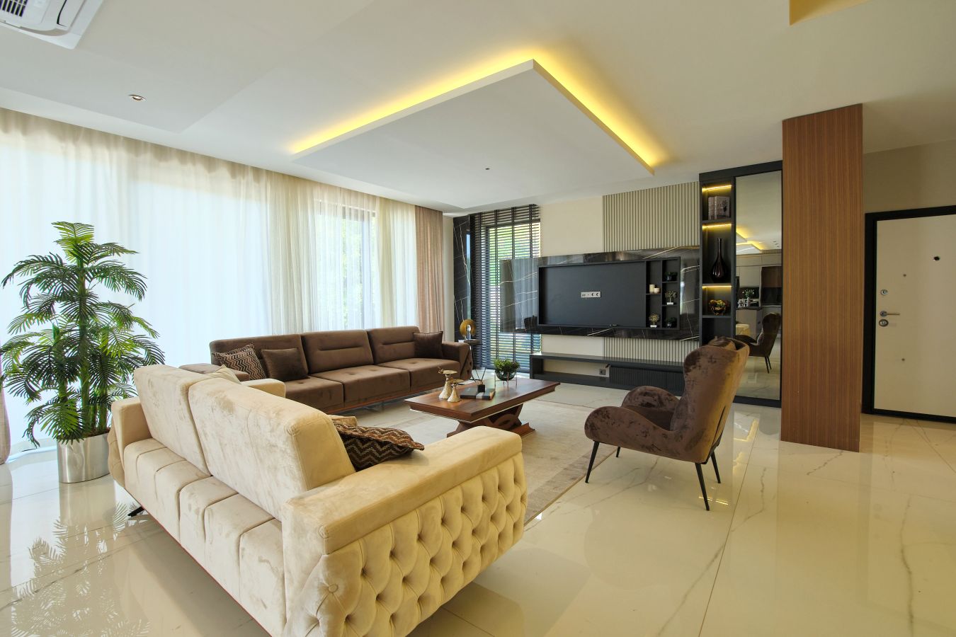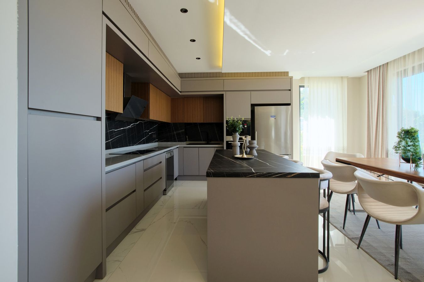 Виллы в стиле Модерн, с отделкой натуральными материалами, спот освещение, алюминиевые профильные окна и двери, подогрев пола, спутниковое ТВ и др. В стоимость входят также: кондиционер в каждой комнате и полный пакет бытовой техники. Планировка 4+1, общая площадь 230 и 250 кв.м.